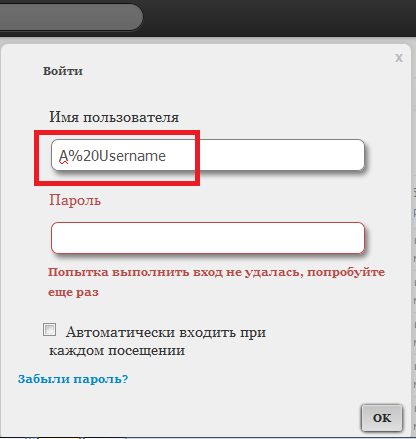 %20 symbol adds to Username if Login attempt is unsuccessful